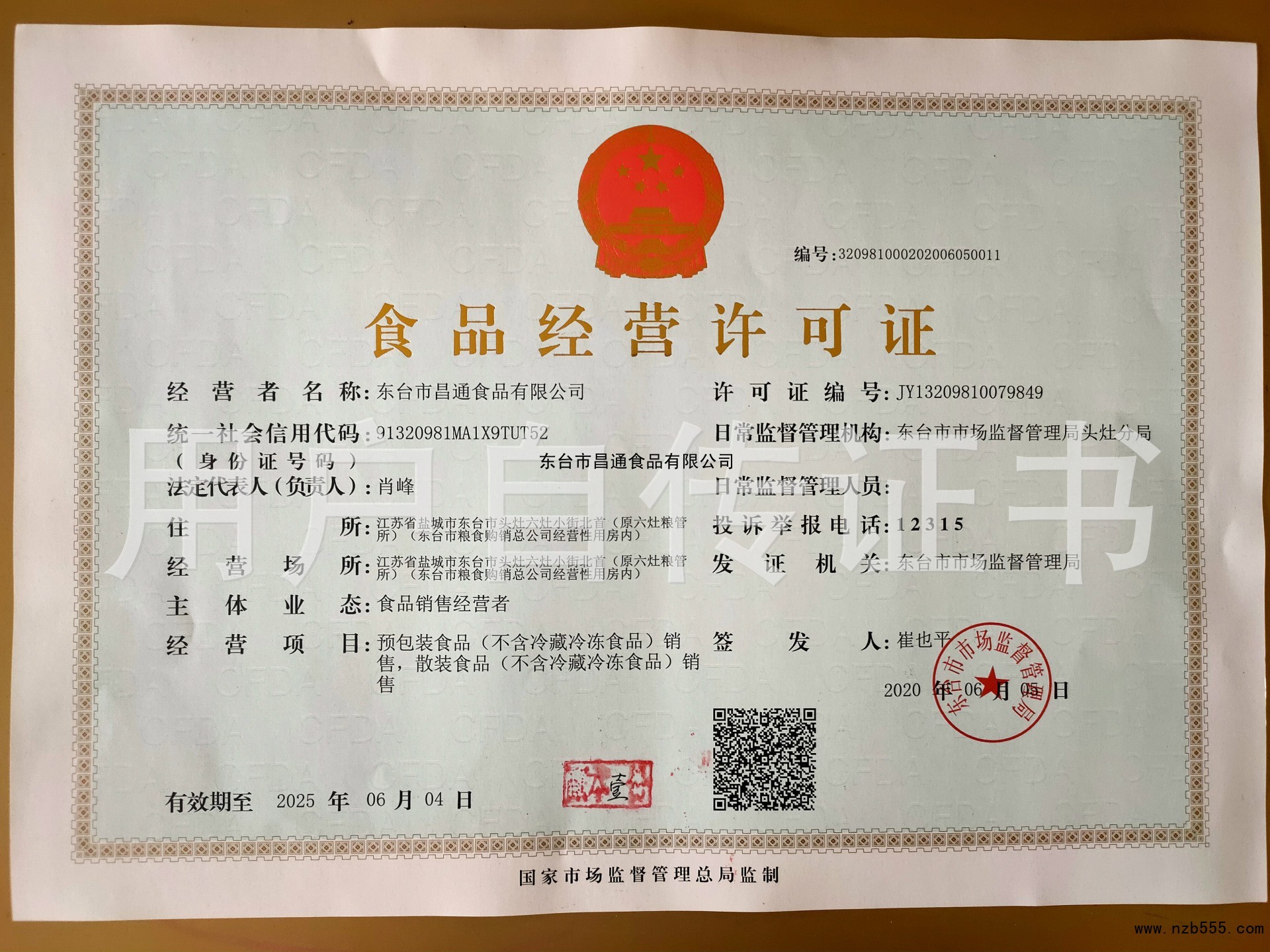 | 發(fā)證機(jī)構(gòu): | 東臺市市場監(jiān)督管理局 | 發(fā)證時(shí)間 : | 2020-06-05 |
