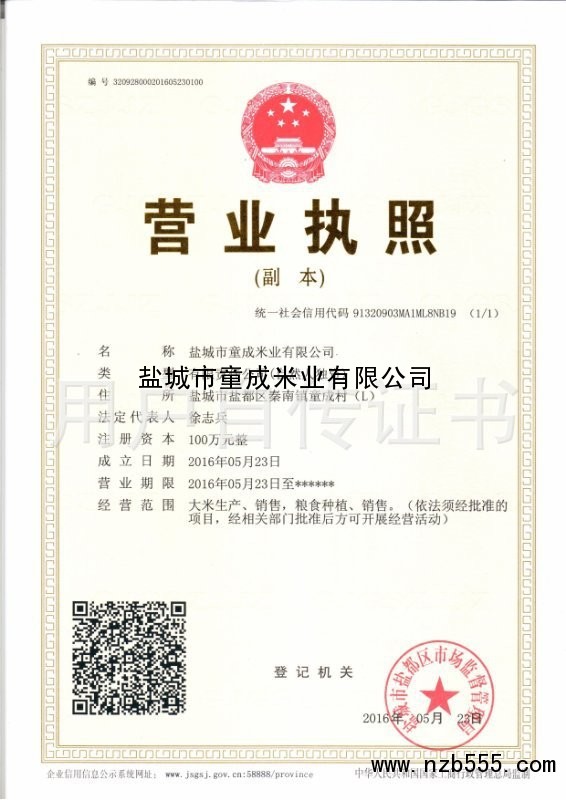 | 發(fā)證機(jī)構(gòu): | 鹽城市都區(qū)市場監(jiān)督管理局 | 發(fā)證時間 : | 2016-05-23 |