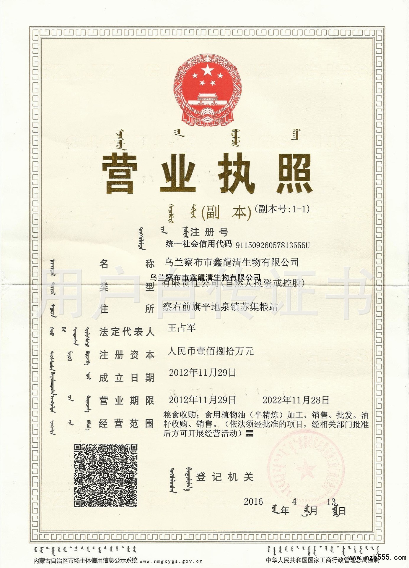 | 發(fā)證機(jī)構(gòu): | 察哈爾后翼前旗工商行政管理局 | 發(fā)證時(shí)間 : | 2016-04-13 |