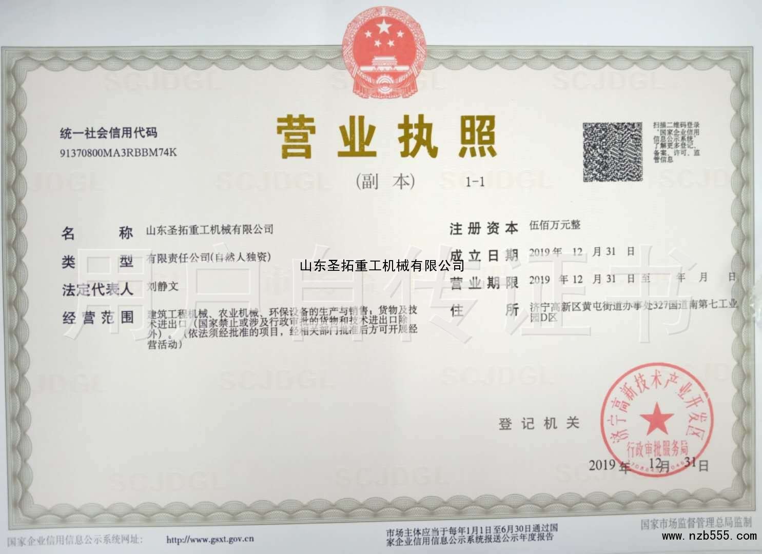| 發(fā)證機(jī)構(gòu): | 濟(jì)寧高新技術(shù)產(chǎn)業(yè)開發(fā)區(qū) | 發(fā)證時(shí)間 : | 2019-12-31 |