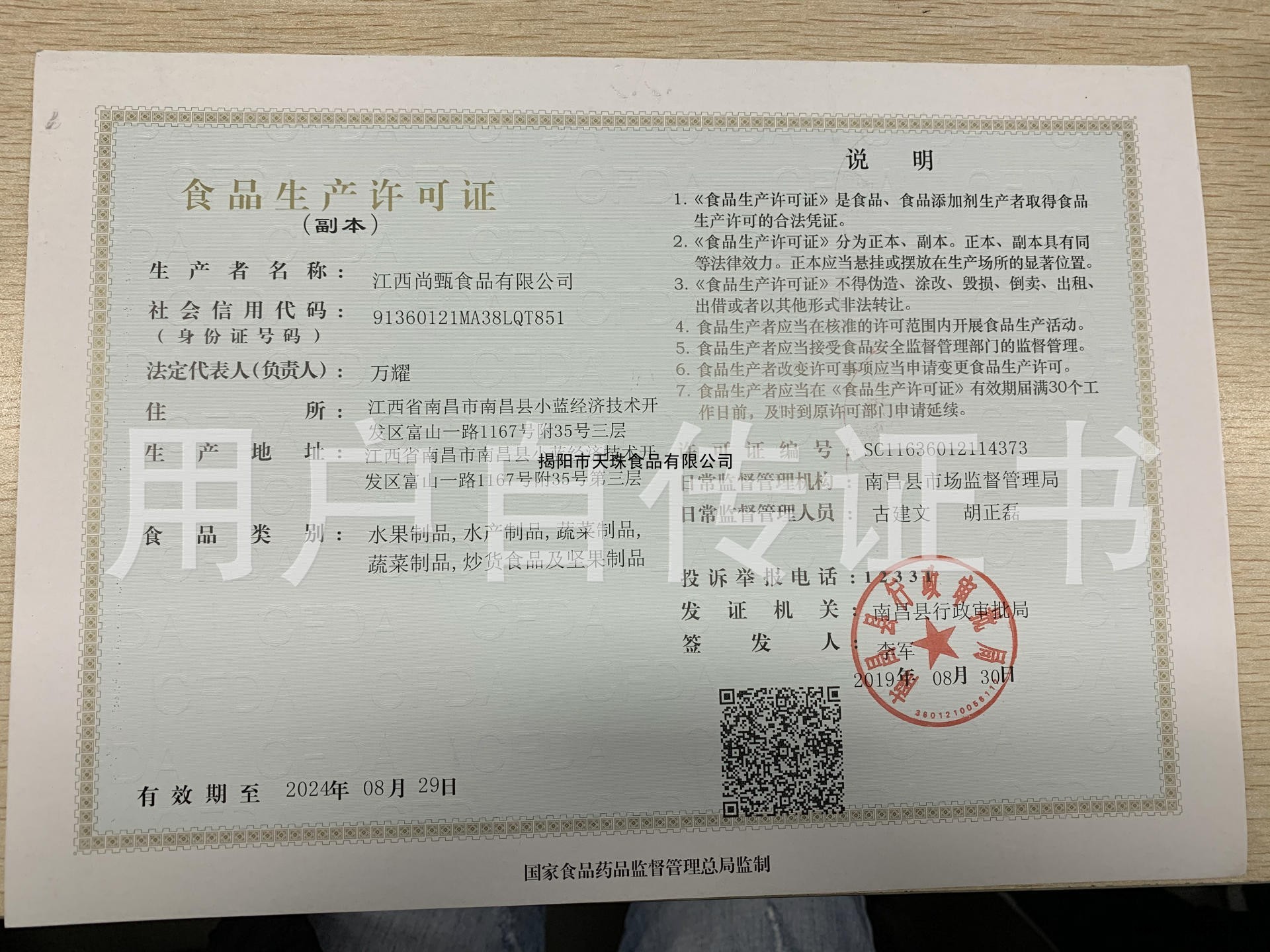 | 發(fā)證機(jī)構(gòu): | 南昌縣行政審批局 | 發(fā)證時(shí)間 : | 2019-08-30 |