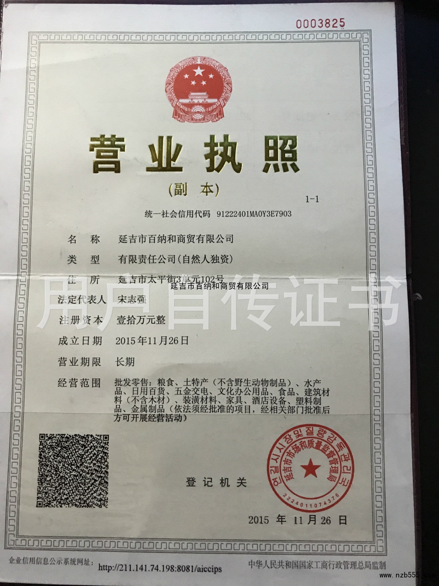 | 發(fā)證機(jī)構(gòu): | 延邊市市場(chǎng)和質(zhì)量監(jiān)督管理局 | 發(fā)證時(shí)間 : | 2015-11-26 |