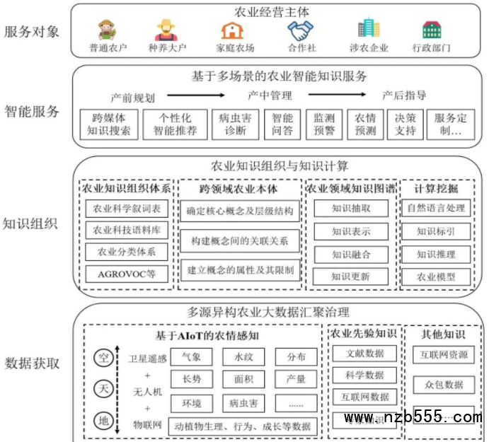 空天地AIoT全維度農(nóng)情感知、多源異構(gòu)農(nóng)業(yè)大數(shù)據(jù)匯聚治理、知識(shí)建模、知識(shí)抽取、知識(shí)融合、知識(shí)推理、跨媒體檢索、智能問答、個(gè)性化推薦技術(shù)、決策支持等農(nóng)業(yè)智能知識(shí)服務(wù)涉及的關(guān)鍵技術(shù),逐步推動(dòng)智慧農(nóng)業(yè)的實(shí)現(xiàn)。