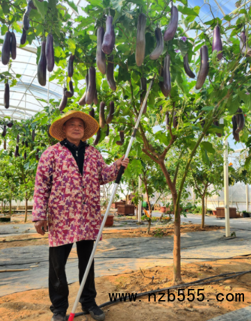 核心提示:茄樹嫁接人參果。  大棚管理人葉自文在多寶茄樹下。  三四十根紫色長茄,錯落有致地垂掛在一棵3米多高的樹上,像極了古代儀