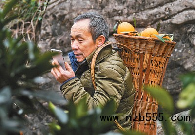 毛相林在背運臍橙途中與水果商進行電話溝通。
