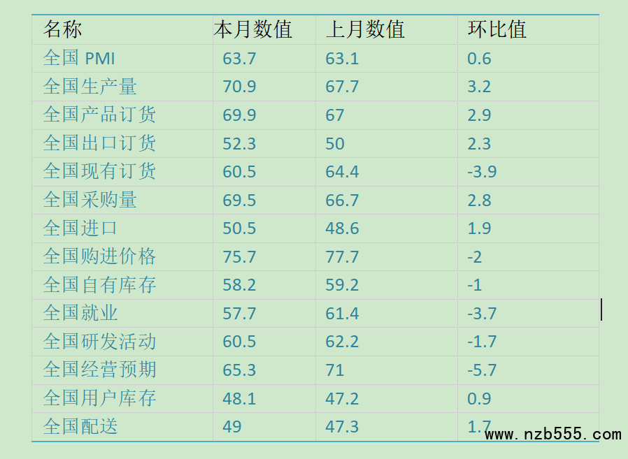 具體觀察各項指標,PMI指標為63.7%,比上月回升0.6個百分點。生產量指標為70.9%,比上月回升3.2個百分點。產品訂貨指標為69.9%,比上月回升2.9個百分點。進口指標為50.5%,比上月回升1.9個百分點。自有庫存指標為58.2%,比上月回落1個百分點。就業指標為57.7%,比上月回落3.7個百分點。