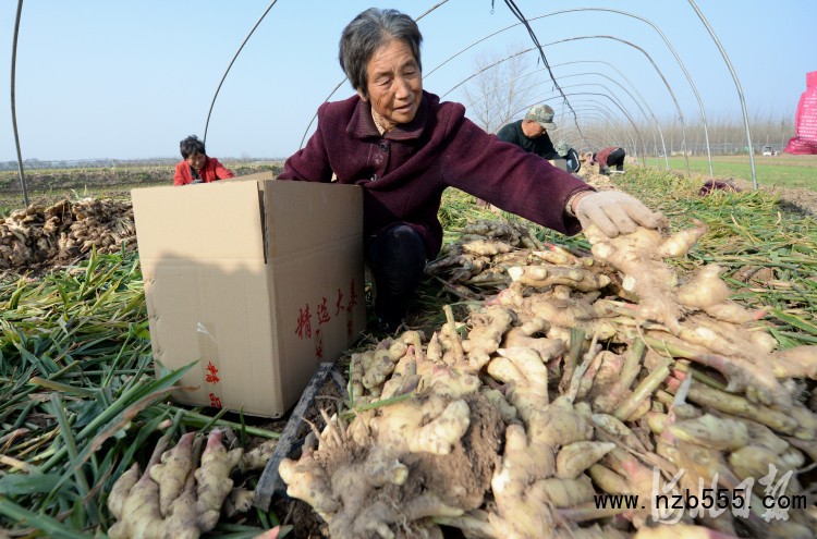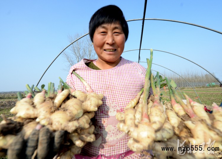 2021年11月4日,河北省磁縣講武城鎮(zhèn)北白道村生姜種植基地內(nèi),種植戶在展示剛剛采收的生姜。河北日?qǐng)?bào)記者杜柏樺攝