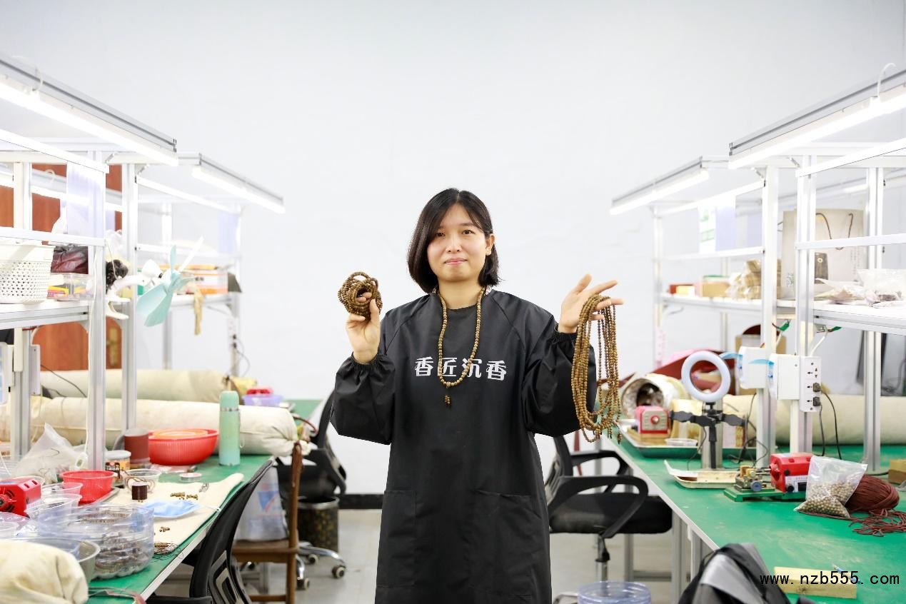 村民湯觀秋家門口就業,制作沉香佛珠手串、沉香席子等。