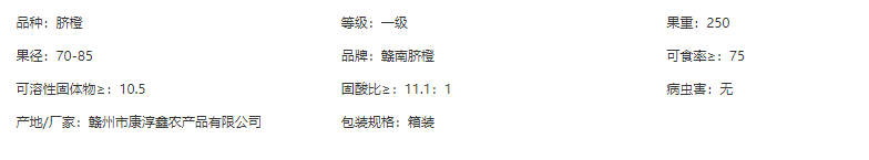 贛南臍橙果大形正,一般每個(gè)250克,橙紅鮮艷,光潔美觀,可食率達(dá)85%,顏色偏紅,比其他產(chǎn)地的橙子顏色略深;果皮光滑、細(xì)膩;果形以橢圓形多見。