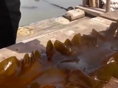 海上的海帶養殖場,原來海帶都是綁在繩子上的,漲知識了